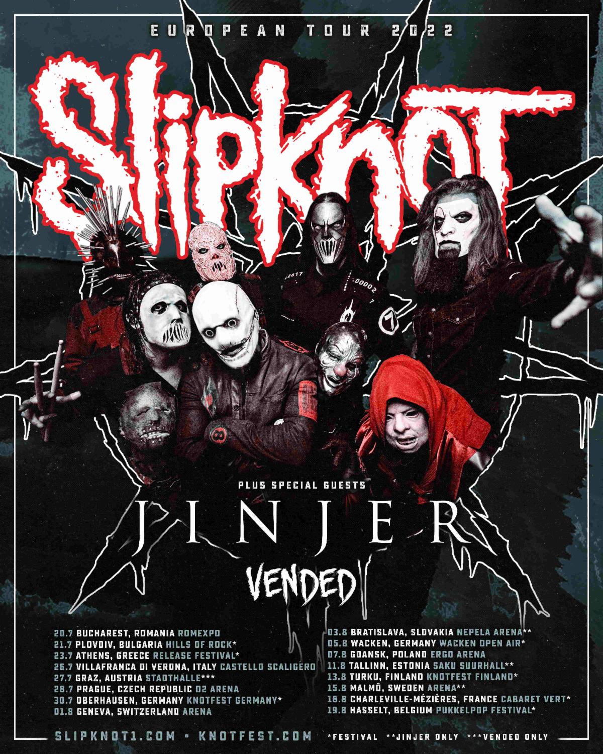 | SLIPKNOT European Tour 2022 Wed 20th July – BUCHAREST (RO) – RomExpo Thu 21st July – PLOVDIV (BG) – Hills Of Rock* Sat 23rd July – ATHENS (GR) – Release Festival* Tue 26th July – VILLAFRANCA DI VERONA (IT) – Castello Scaligero Wed 27th July – GRAZ (AT) – Messe Open Air Thu 28th July – PRAGUE (CZ) – O2 Arena Sat 30th July – OBERHAUSEN (DE) – Knotfest Germany* Mon 1st Aug – GENEVA (CH) – Arena Wed 3rd Aug – BRATISLAVA (SL) – Nepela Arena Sat 6th Aug – WACKEN (DE) – Wacken* Sun 7th Aug – GDANSK (PL) – Ergo Arena Tue 9th Aug – KRANJ (SL) – Supernova Open Air Thu 11th Aug – TALLINN (EST) – Saku Suurhall Sat 13th Aug – TURKU (FI) – Knotfest Finland* Mon 15th Aug – MALMO (SE) – Arena Thu 18th Aug – CHARLEVILLE-MEZIERES (FR) – Cabaret Vert* Fri 19th Aug – HASSELT (BL) – Pukkelpop* * Festival | ![]() |